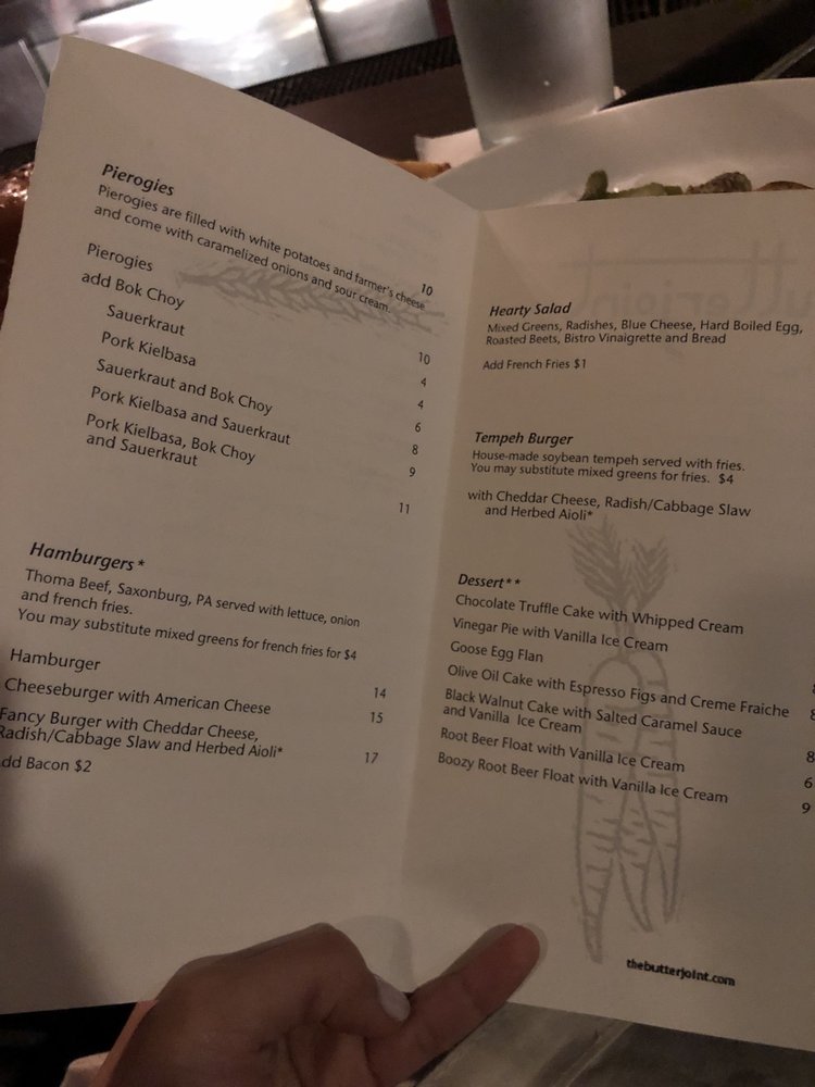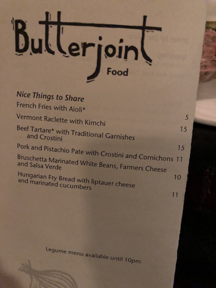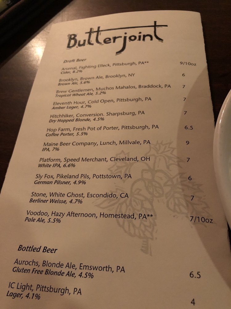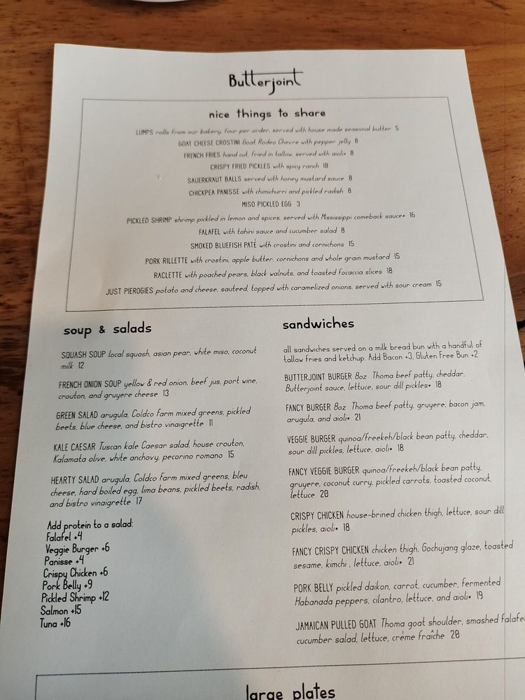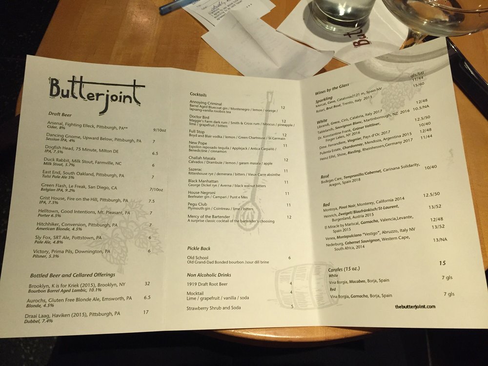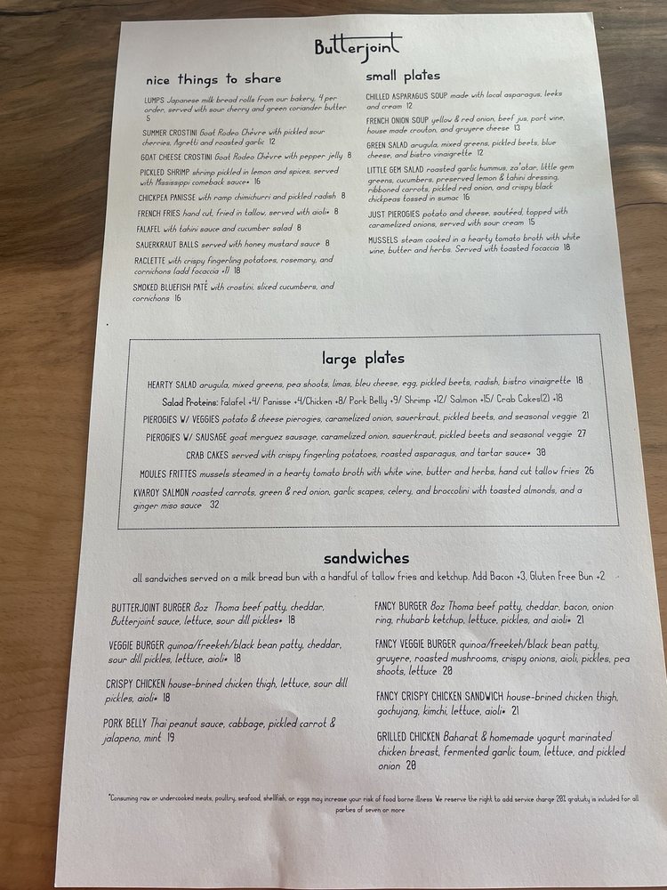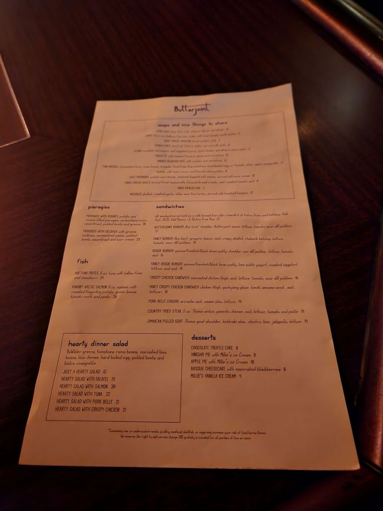 Butterjoint, located in Pittsburgh, offers a diverse menu of American cuisine with a focus on small plates like GrassFed Beef Tartare and Tempura Squash Blossoms. Customers rave about the Veggie Burgers and French Fries, as well as the excellent service and outdoor seating options. The ambiance at Butterjoint is described as classy, with a separate bar area, indoor dining room, and patio dining. The menu also includes Pierogies, the Hearty Dinner Salad, and unique dishes like Shakshuka and Vinegar Pie. Overall, Butterjoint is praised for its delicious food, friendly staff, and cozy atmosphere, making it a must-visit spot for those looking for a memorable dining experience.